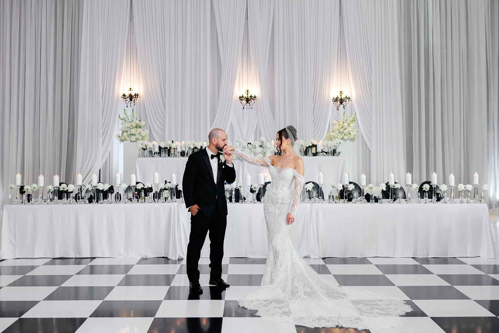 Modern elegance met architectural drama during this unforgettable wedding celebration at Sky Hangar, where sleek design and bold black-and-white styling created a striking backdrop for the couple’s day. The morning began with refined, light-filled getting-ready moments before portraits at Simon Fraser University added a dramatic, editorial contrast with its iconic concrete geometry and grand staircases. The day ended at Sky Hanger, where the expansive white draping, checkered dance floor, and candlelit reception design transformed the industrial space into a sophisticated, high-impact setting that felt both contemporary and romantic. From champagne toasts and luxury details to the helicopter arrival and a packed dance floor, every part of the day blended modern style with high energy, resulting in a wedding gallery filled with movement, emotion, and timeless visual impact.